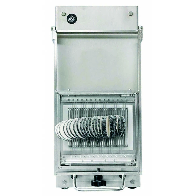 La mini-guitare est adaptée pour les produits de forme ronde comme le fromage de chèvre présenté sur la photo. La largeur des tranches obtenues est de 5 mm.